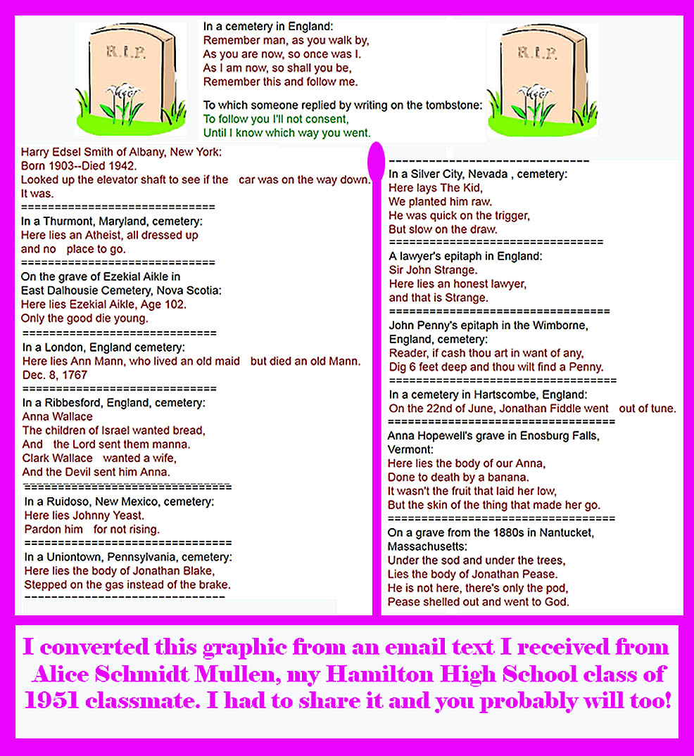 Above are three graphics relating to the upcoming 55th reunion of Hamilton High's class of 1960. Thanks to my Hamilton Historical Society colleague Eleanor Goldy Guear. I have tried to incorporate all the necessary information on the reunion into a single page but it was an impossible task. I had to break them down into separate pages as displayed above.